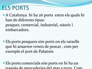 ELS PORTSA Catalunya hi ha 26 ports entre els quals hi han de diferents tipus: pesquer, comercial, industrial, nàutic i embarcadors.Els ports pesquers són ports on els vaixells que hi amarren venen de pescar , com per exemple el port de PalamósEls ports comercials són ports on hi ha un traspàs de mercaderies del mar a terra. Com per exemple el port de Vilanova i la Geltrú