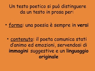 La poesia si distingue dalla prosa per la sua forma in versi e l'espressione di emozioni attraverso immagini e linguaggio originale. Le caratteristiche fondamentali includono versi, rime e strofe, con diversi schemi di rima come baciata, alternata e incatenata. L'analisi poetica comprende la comprensione del contenuto, l'uso di figure retoriche e l'interpretazione personale del messaggio.