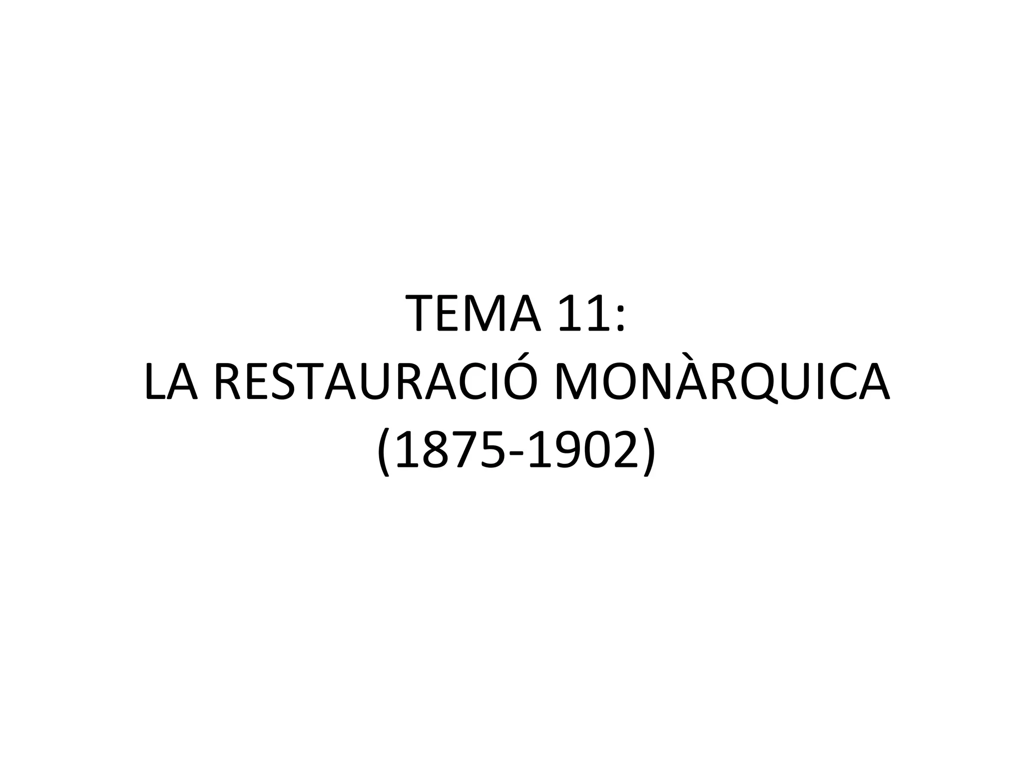 INTRODUCCIÓ La Restauració de 1875 al 1902 estabilitat constitucional del 1902 al 1931 crisi del sistema de la Restauració La Restauració va suposar la modernització econòmica i l’allunyament de l’exèrcit de la vida política, però també un domini de la burgesia oligàrquica, el caciquisme... Va haver de fer front als moviments socials, als nacionalismes i a la crisi del 98.