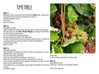 This document provides information about a 4-day wine tour package in La Rioja, Spain. The tour includes transfers, 3-4 star hotel accommodations, full breakfast each day, lunches on excursion days, and dinners including a gala dinner. Each day includes visits to wineries, vineyards, and towns, with tastings and games. Prices are provided for individual travelers, groups, and senior groups, starting from €295 per person depending on hotel category and number of travelers. The tour requires a minimum of 2 people for individuals and 30 people for groups.