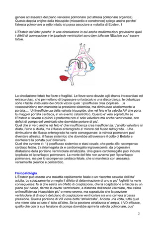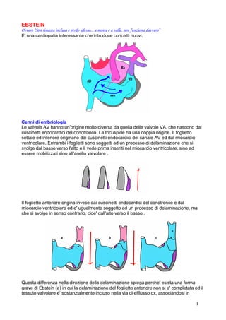 Il documento analizza la cardiopatia di Ebstein, evidenziando le complessità nell'embriologia della valvola tricuspide e le sue implicazioni fetali, tra cui l'insufficienza della valvola che può essere letale nel neonato. Viene discussa la fisiopatologia del difetto, con particolare riferimento all'atresia polmonare funzionale e organica, e ai vari approcci clinici per il trattamento della malattia in diverse presentazioni cliniche. Infine, si sottolinea l'importanza della diagnostica per immagini e della classificazione della malattia per determinare le strategie terapeutiche più appropriate.
