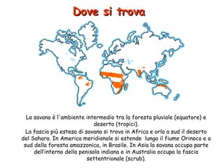 La savana è un ecosistema intermedio tra foreste pluviali e deserti, caratterizzato da praterie, cespugli e alberi sparsi, che si estende principalmente in Africa, America Meridionale, Asia e Australia. Questo ambiente presenta temperature elevate, stagioni ben definite e una fauna diversificata, comprendente numerosi erbivori e carnivori. Sebbene favorevole all'agricoltura e all'allevamento, la savana affronta problemi di desertificazione e sfruttamento delle risorse, con un aumento del turismo che beneficia poco le popolazioni locali.