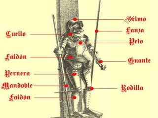 4._Com vestien? Sotal'armadura, els cavallers portaven un perpunt , una mena de gipò o jaqueta embrutada. L'ausberg o gonió: era una túnica de coto de malla amb una caputxa anomenada capmall. Al principi,el casc o elm duia un nasal per protegeix el nas. Armadura: protegia molt millor que l'augsberg. Solia estar feta se ferro o d'acer plategat i cabria tot el cos del cavaller. Elm: casc intregral que cobria tot el cap. Cuirasa: tros de ferro que cobria el tronc. Cuixera: tros de ferro que cobria les cuixes