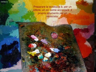 Il documento descrive il processo creativo di un pittore, paragonando la preparazione della tavolozza all'accordatura di uno strumento musicale. Sottolinea l'importanza dell'ispirazione, che può derivare da esperienze sensoriali, nostalgie e ricordi, per trasformare i colori in forme artistiche. Infine, evidenzia come l'opera d'arte finale riveli l'essenza dell'artista e meriti di essere esposta.