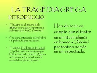 LA TRAGÈDIA GREGAINTRODUCCIÓ El teatre és el gènere de la πόλις i té una gran importància sobretot al s. VaC a Atenes. Crea una interacció entre l’obra i el públic, fa que reaccioni. Exemple: Els Perses d’Èsquil El públic està content perquè l’obra descriu la ciutat d’Atenes amb grans adjectius davant la mare del rei persa, Xerxes. Hem de tenir en compte que el teatre és un ritual religiós en honor a Dionís i per tant no només és un espectacle.