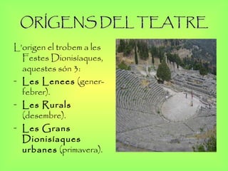 ORÍGENS DEL TEATREL’origen el trobem a les Festes Dionisíaques, aquestes són 3: Les Lenees (gener- febrer). Les Rurals (desembre). Les Grans Dionisíaques urbanes (primavera).