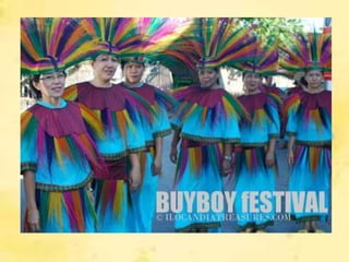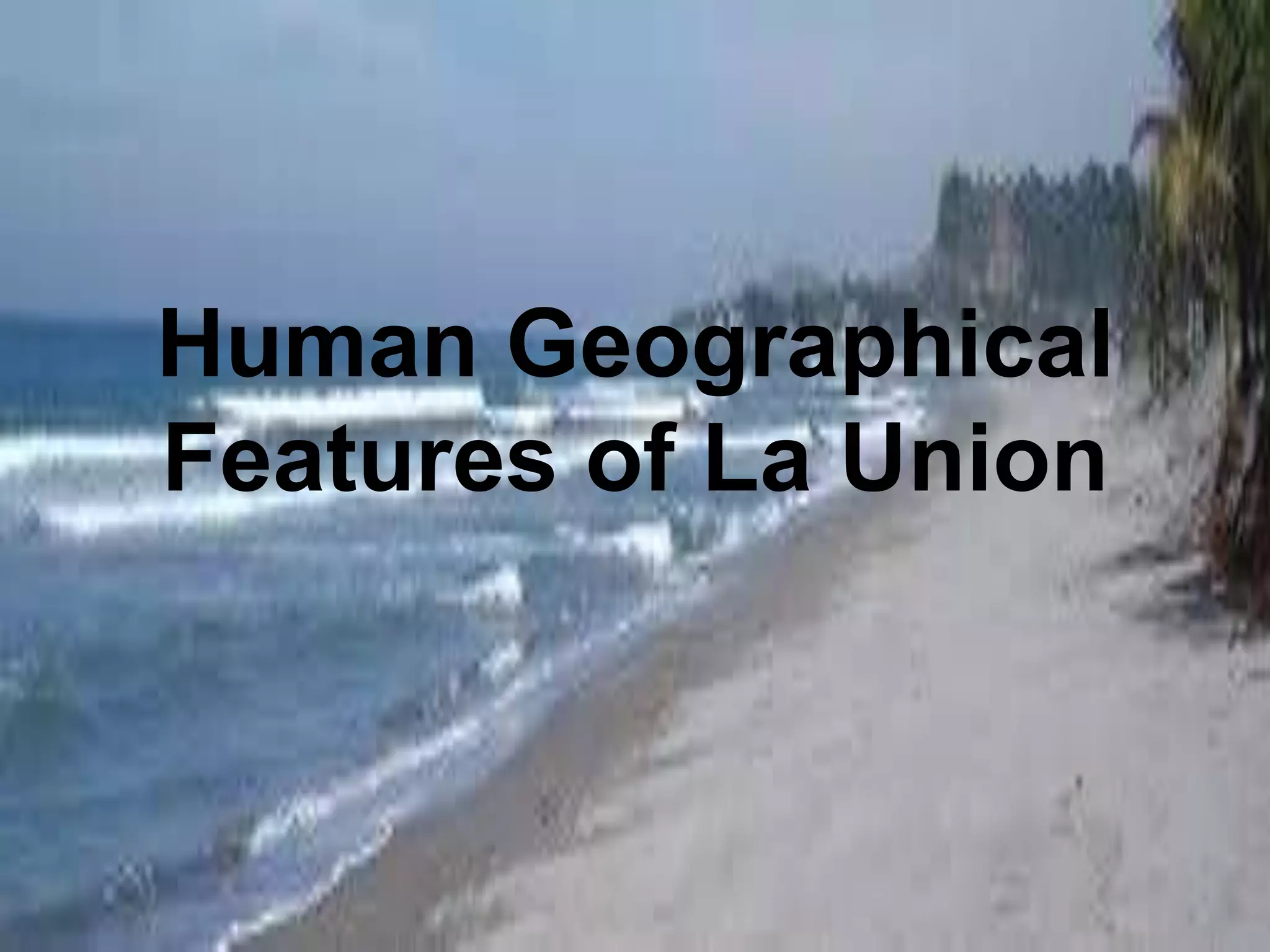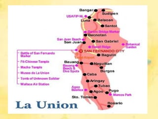 La Union was created as a province in 1850 by combining areas from Pangasinan, Ilocos Sur, and the Cordilleras. It has experienced transformations in its socio-cultural and economic aspects over time. The population is predominantly Ilocano and Catholic. Important industries include agriculture, manufacturing, and services. The province celebrates several festivals celebrating local culture and cuisine, such as the Kilawen, Buyboy, and Dinengdeng festivals. Famous people from La Union include Diego Silang, Gloria Diaz, and Camilo Osias.