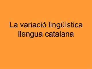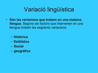 Variació lingüística Sónles variacions que trobem en una mateixa llengua . Segons els factors que intervenen en una llengua trobem les següents variacions: Històrica Estilística Social geogràfica