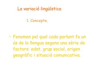La variació lingüística1. Concepte. Fenomen pel qual cada parlant fa un ús de la llengua segons una sèrie de factors: edat, grup social, origen geogràfic i situació comunicativa.