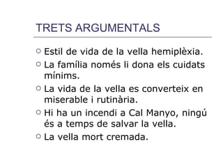 TRETS ARGUMENTALS Estilde vida de la vella hemiplèxia. La família només li dona els cuidats mínims. La vida de la vella es converteix en miserable i rutinària. Hi ha un incendi a Cal Manyo, ningú és a temps de salvar la vella. La vella mort cremada.