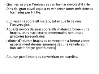 Quan es vacrear l’univers es van formar núvols d’H i HeDins del gran núvol aquest es van crear zones més denses formades per H i He. L’univers fira sobre ell mateix, tot el que hi ha dins l’univers gira.Aquests nùvols de girar sobre ells mateixos formen uns braços, unes estructures anomenades nebuloses giratòries (pre-galaxies)I dintre d’aquests braços es començaran a formar zones especialment denses anomenades una vegada els hi han sortit braços (protó estels) Aquests protó estels es convertiran en estrelles.