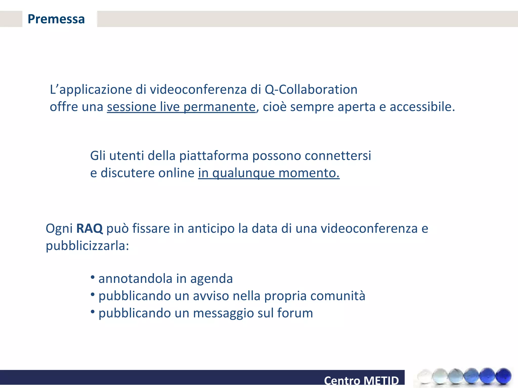 La piattaforma Q-Collaboration consente videoconferenze permanenti tramite Adobe Connect, permettendo agli utenti di connettersi e discutere in qualsiasi momento. Gli utenti devono soddisfare requisiti di sistema specifici e seguire una procedura per impostare l'audio prima di iniziare il meeting. Durante le conferenze, possono alzare la mano per prenotare interventi, chattare e condividere lo schermo.