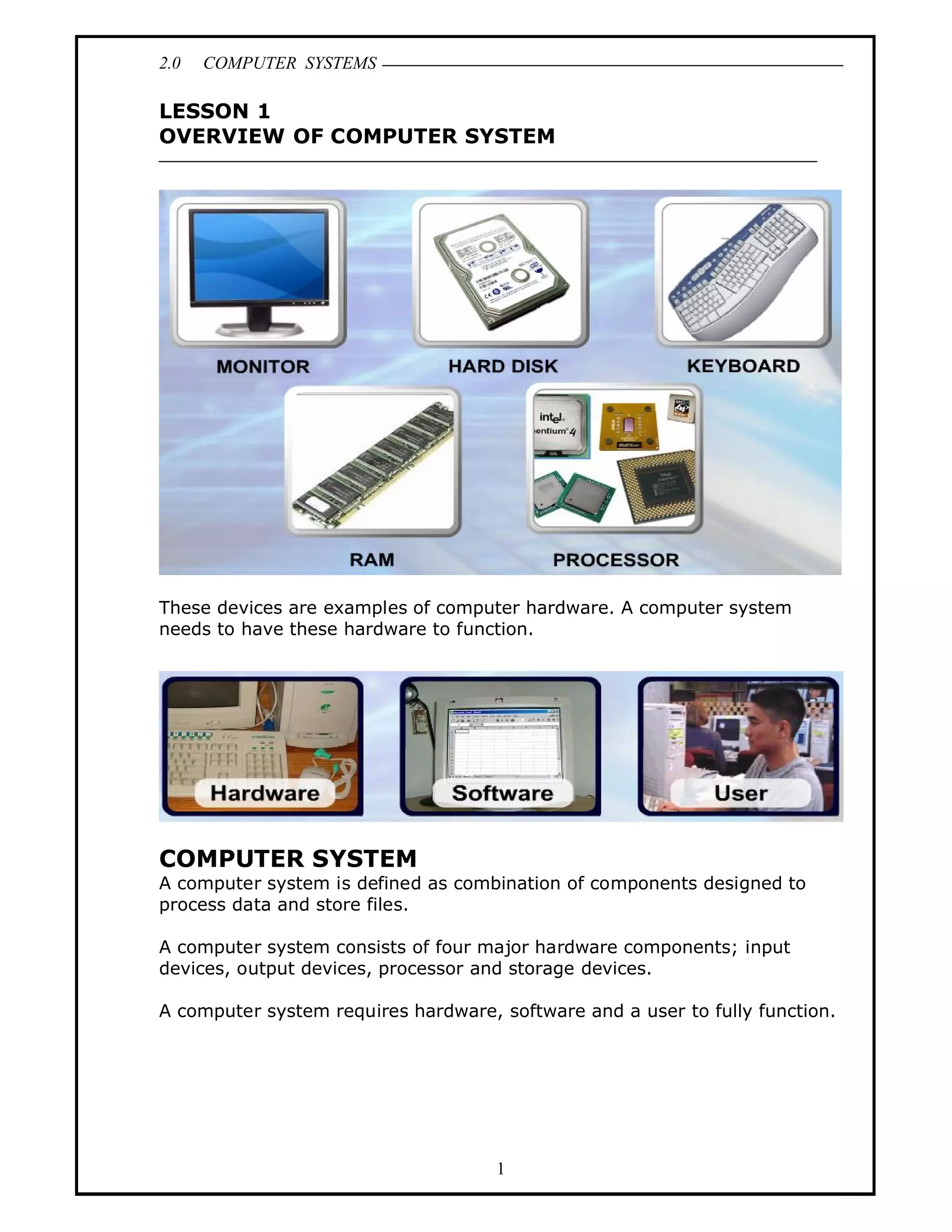 A computer system consists of hardware components like input devices, an output processor, and storage devices. It also requires software and a user. The document then discusses each component in detail, explaining how a computer processes data through an information processing cycle of input, processing, storage, and output. It also covers how data is represented in binary using bits and bytes and different character coding schemes.