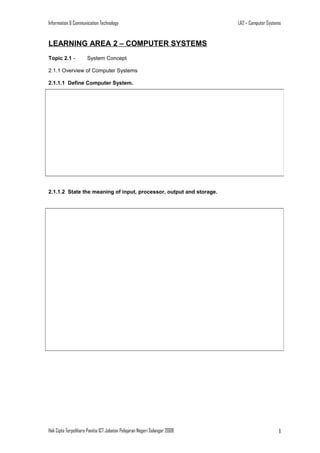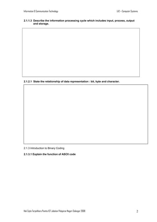 This document outlines topics related to computer systems, including definitions of key concepts like input, processor, output, and storage. It describes the basic information processing cycle and data representation at the bit and byte level. Measurement units for data, clock speed, and types of hardware components like CPUs, memory, storage devices, input/output devices are defined. The document also discusses operating systems, application software, and utility programs. Finally, it addresses assembling computer systems, partitioning and formatting storage, and installing software.