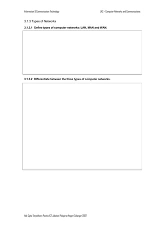 This document outlines topics related to computer networks and communications. It covers basic concepts such as defining networks and communications, types of networks including LAN, MAN and WAN, network architectures like client/server and peer-to-peer, and network topologies including bus, ring and star. The document also discusses hardware requirements for networking including devices like NICs, modems, hubs and routers, as well as cabling and wireless transmission media. Software requirements cover network operating systems and client software. Additional sections provide information on setting up network facilities and current/future developments in networking technology.