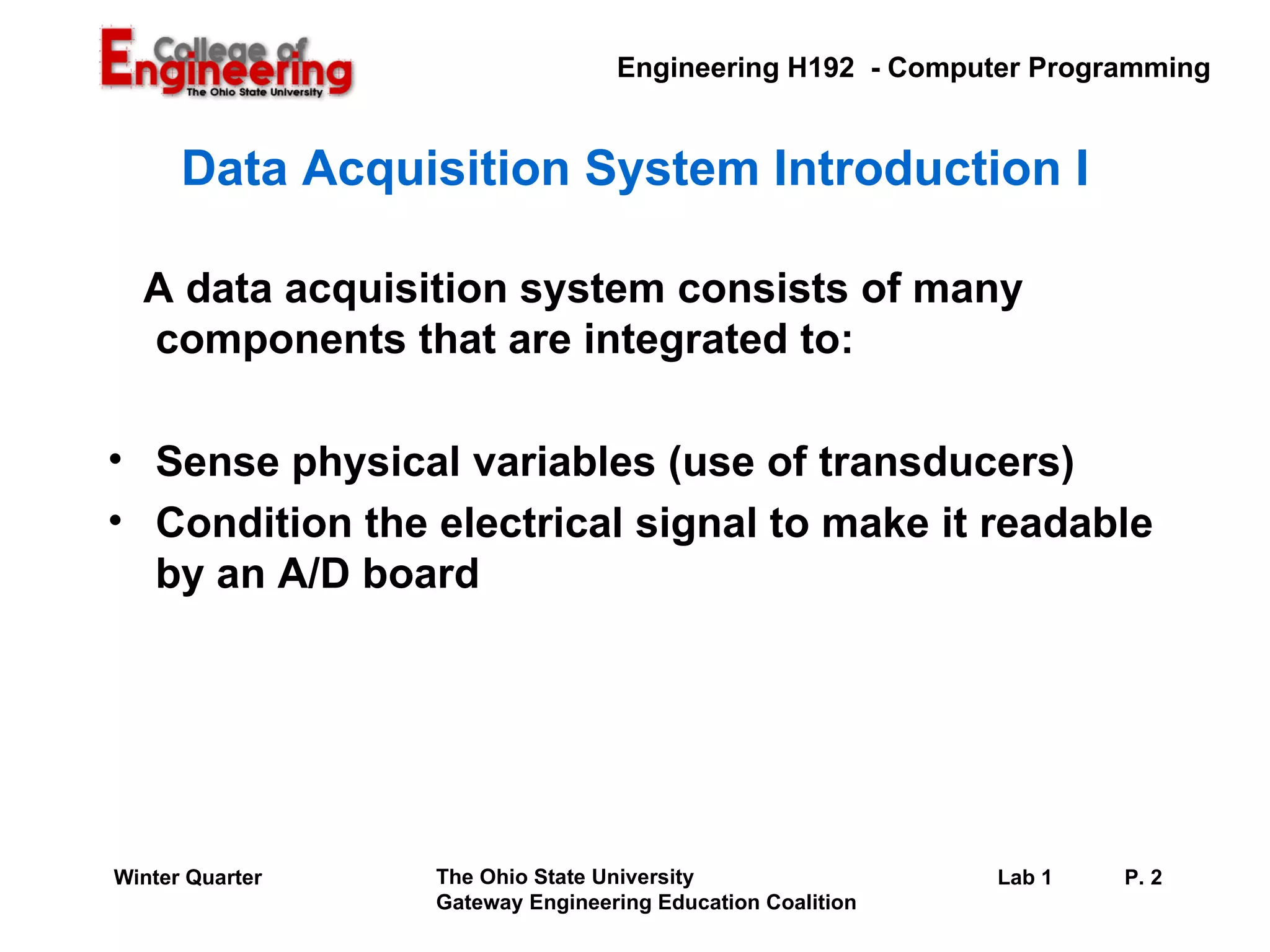 A data acquisition system consists of components to sense physical phenomena using transducers, condition the electrical signals, convert the analog signals to digital format, and process the data using software. Transducers sense phenomena and produce analog electrical signals, which are then conditioned and amplified. An analog-to-digital converter samples the analog signals at a rate and resolution and converts them to digital format. Data acquisition software transforms the computer and hardware into a system that can analyze, store, and display the acquired data. Factors to consider in designing such a system include the type of input signals, frequency, resolution, and compatibility of hardware and software components.