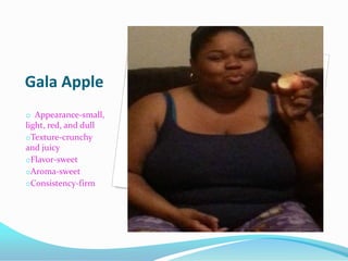 Lachanda Martin conducted evaluations of different foods including a Gala apple, cheddar cheese, chocolate pudding, honey, and saltine crackers. The Gala apple was small, red, and dull with a crunchy and juicy texture and sweet flavor and aroma. The cheddar cheese was orange and yellow, soft in texture, salty in flavor with a sour aroma. The chocolate pudding had a creamy appearance, silky texture, chocolate flavor and sweet cocoa aroma with a soupy consistency. Honey had an extra sweet flavor and was liquid and heavy in texture. The saltine cracker was thin and square with a dry, crisp texture, salty flavor and no aroma and was light in consistency.