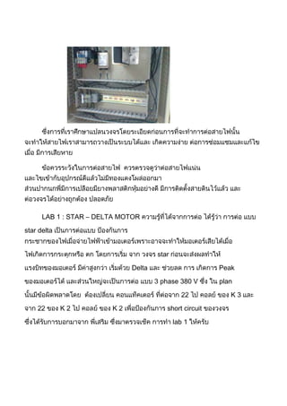 The document outlines 5 labs: 1) a star-delta motor starter lab, 2) a forward-reverse motor lab, 3) a PLC digital practices lab using terminals, switches and relays, 4) a PLC analog practices lab using digital and analog components, and 5) a cabinet equipment practices lab using transformers, modems and networking equipment to connect computers.