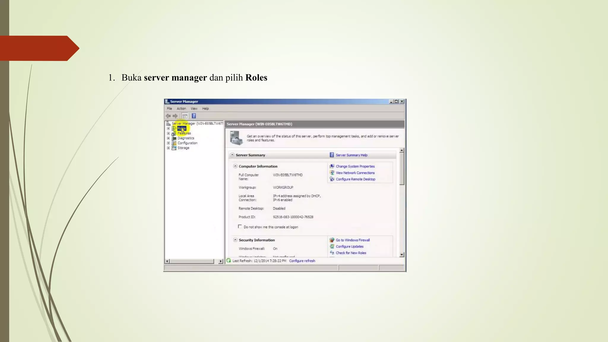 Dokumen tersebut memberikan instruksi langkah demi langkah untuk menginstal dan mengkonfigurasi Web Server (IIS) pada sistem operasi Windows, meliputi penambahan peran Web Server menggunakan Server Manager, pengaturan fitur yang dibutuhkan, penambahan situs web, dan pengaturan alamat IP untuk mengaksesnya melalui browser.