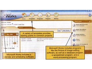 This document discusses different types of computer software, including system software and application software. System software consists of operating systems and utility programs that control computer operations and interface between hardware, users, and application software. Application software includes productivity programs like word processors and spreadsheets, as well as multimedia, home, and business programs. Productivity software is bundled into integrated packages, suites, and web-based applications for ease of use.