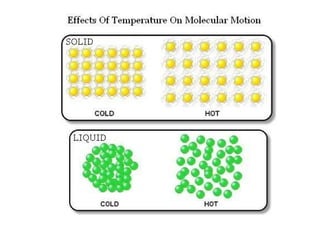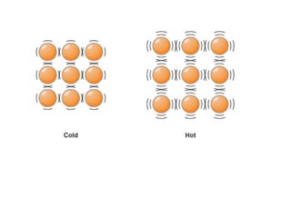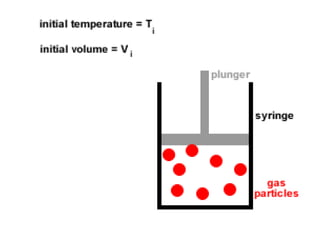The document discusses how increasing the temperature of gas particles affects their kinetic energy, density, and pressure. Heating gas particles gives them more kinetic energy, lowering their density and increasing the pressure they exert on container walls. Heating trapped air particles expands the volume they occupy by speeding up the particles' motion, while heating the air in a hot air balloon makes it less dense than the surrounding air, enabling it to float.