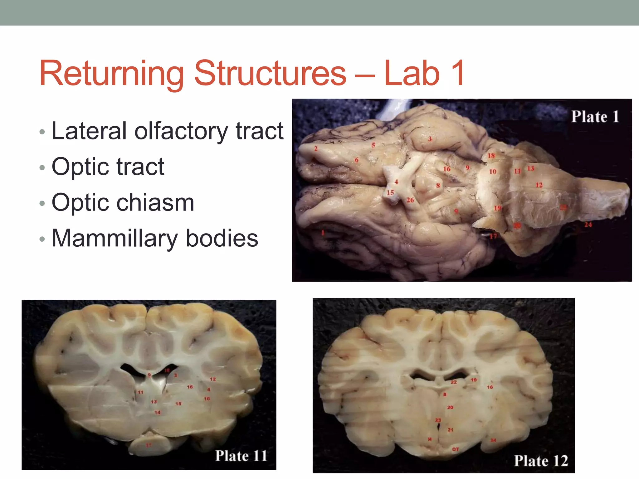 This document provides a summary of returning structures from previous labs and new structures seen in the coronal view of the brain. It lists structures seen in Labs 1-3 such as the lateral olfactory tract, optic tract, corpus callosum, and hippocampus. New structures discussed include the corona radiata, which relays sensory information from the thalamus to the cortex, the reticular formation which is involved in sleep, movement and vital reflexes, and the substantia nigra which produces dopamine and is involved in basal ganglia functioning.