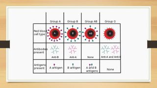 The ABO blood antigens are carbohydrates linked to cell surface proteins that are synthesized by polymorphic glycosyltransferase enzymes. There are three allelic variants of this gene that determine blood type: type O has no enzymatic activity, type A adds N-acetylgalactosamine, and type B adds galactose. Rh antigens are non-glycosylated proteins found in red blood cells and determine Rh factor. Anti-RhD antibodies can cause hemolytic disease of the newborn by destroying fetal red blood cells if the mother is Rh-negative and carries an Rh-positive fetus.