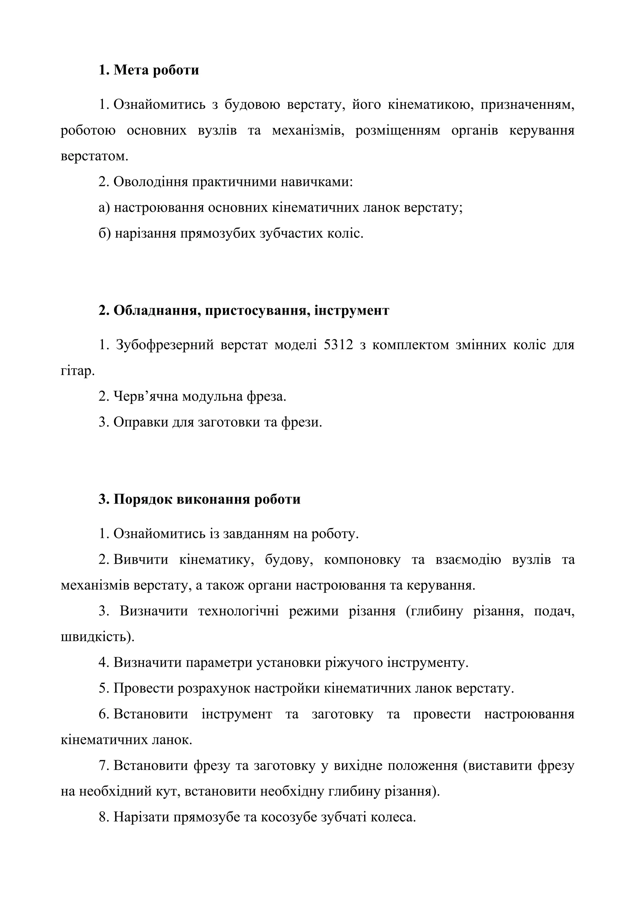 1. Ознайомитись з будовою верстату, його кінематикою, призначенням,