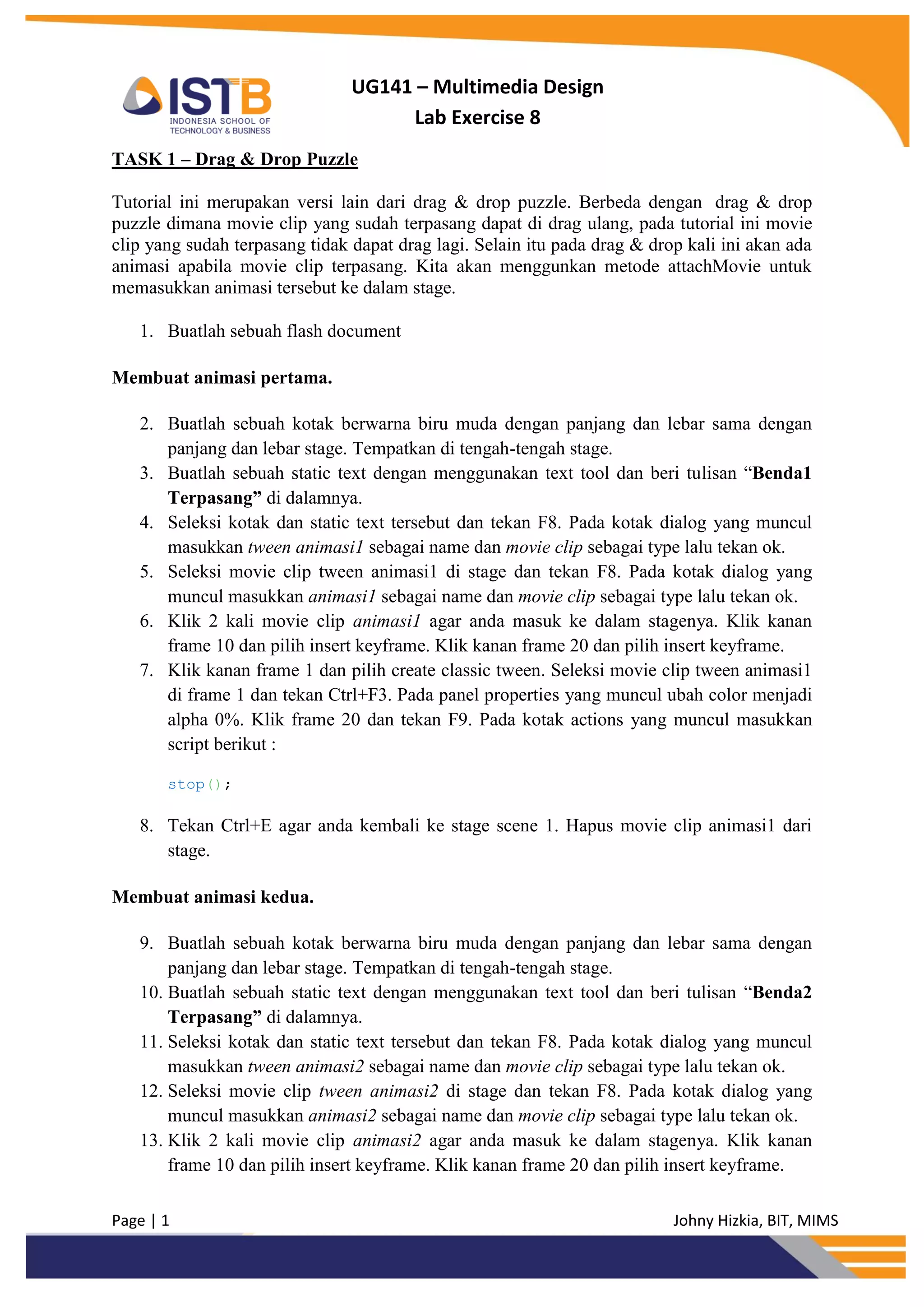 Dokumen ini memberikan instruksi lengkap untuk membuat animasi drag and drop puzzle dengan ActionScript di Adobe Flash. Instruksinya meliputi pembuatan objek, tween animasi, pengaturan linkage, dan penambahan script untuk mengaktifkan fitur drag and drop. Script akan meletakkan kembali objek yang dilepaskan ke posisi semula dan memicu animasi apabila terpasang dengan benar.