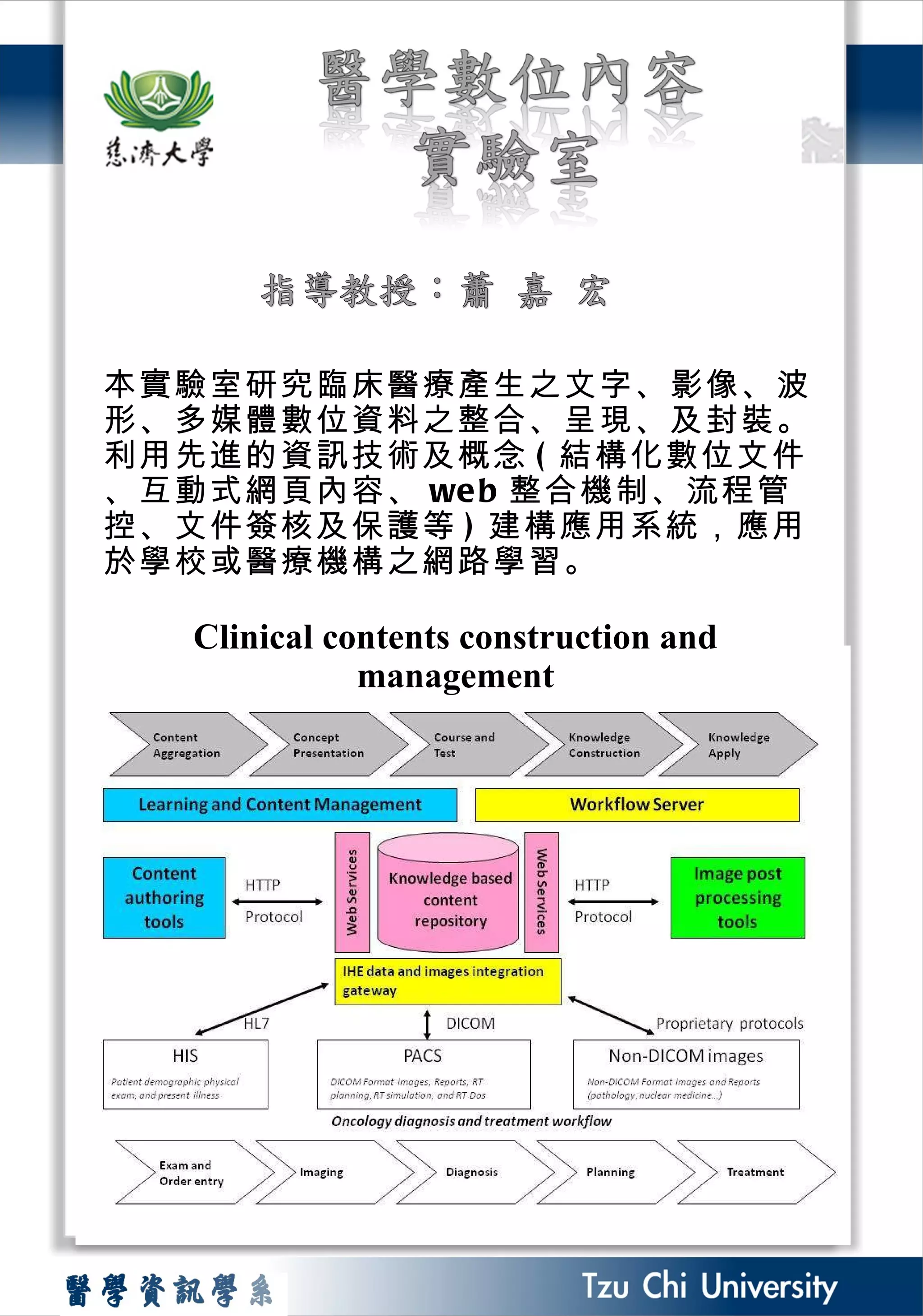 本實驗室研究臨床醫療產生之文字、影像、波形、多媒體數位資料之整合、呈現、及封裝。利用先進的資訊技術及概念 ( 結構化數位文件、互動式網頁內容、