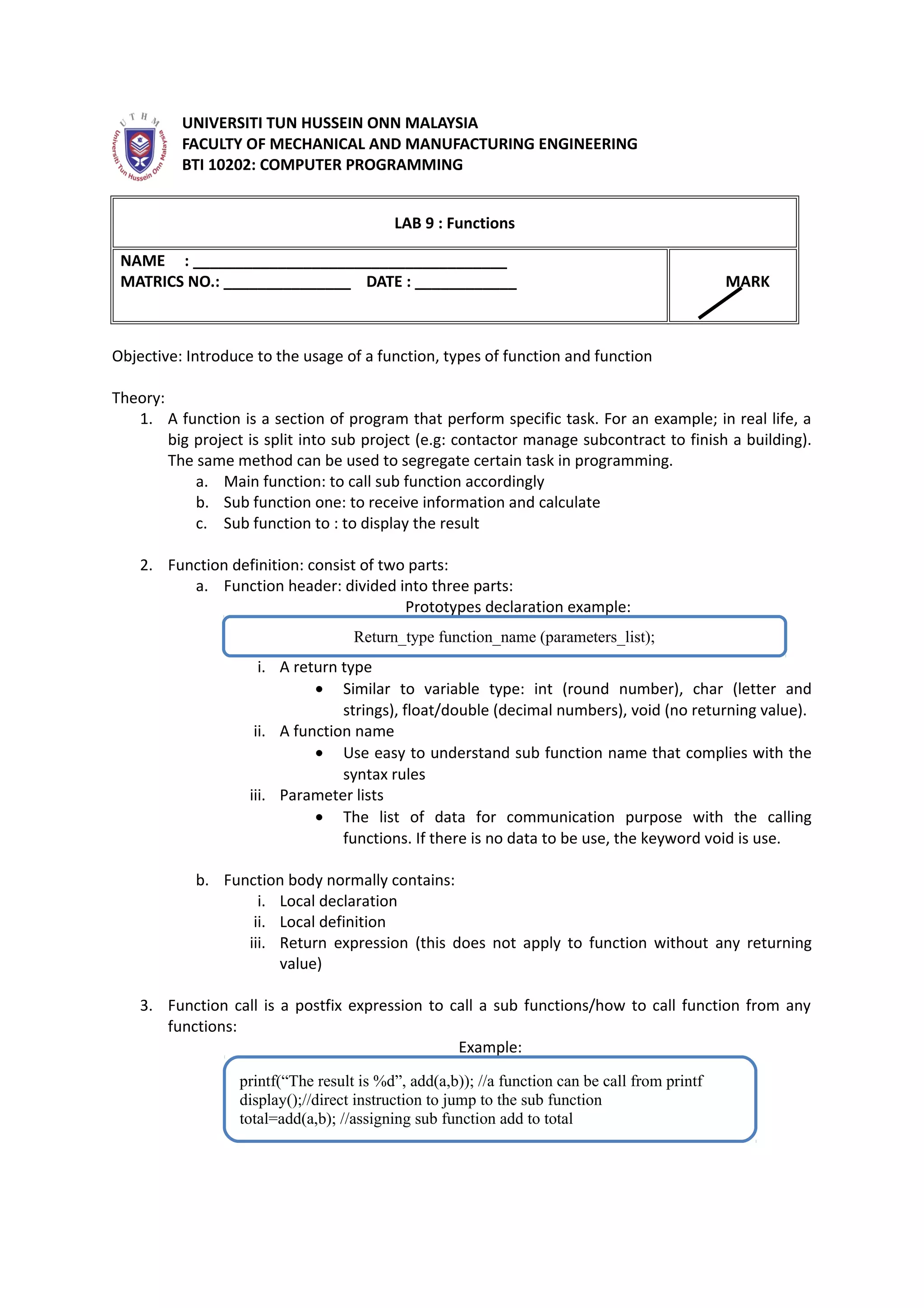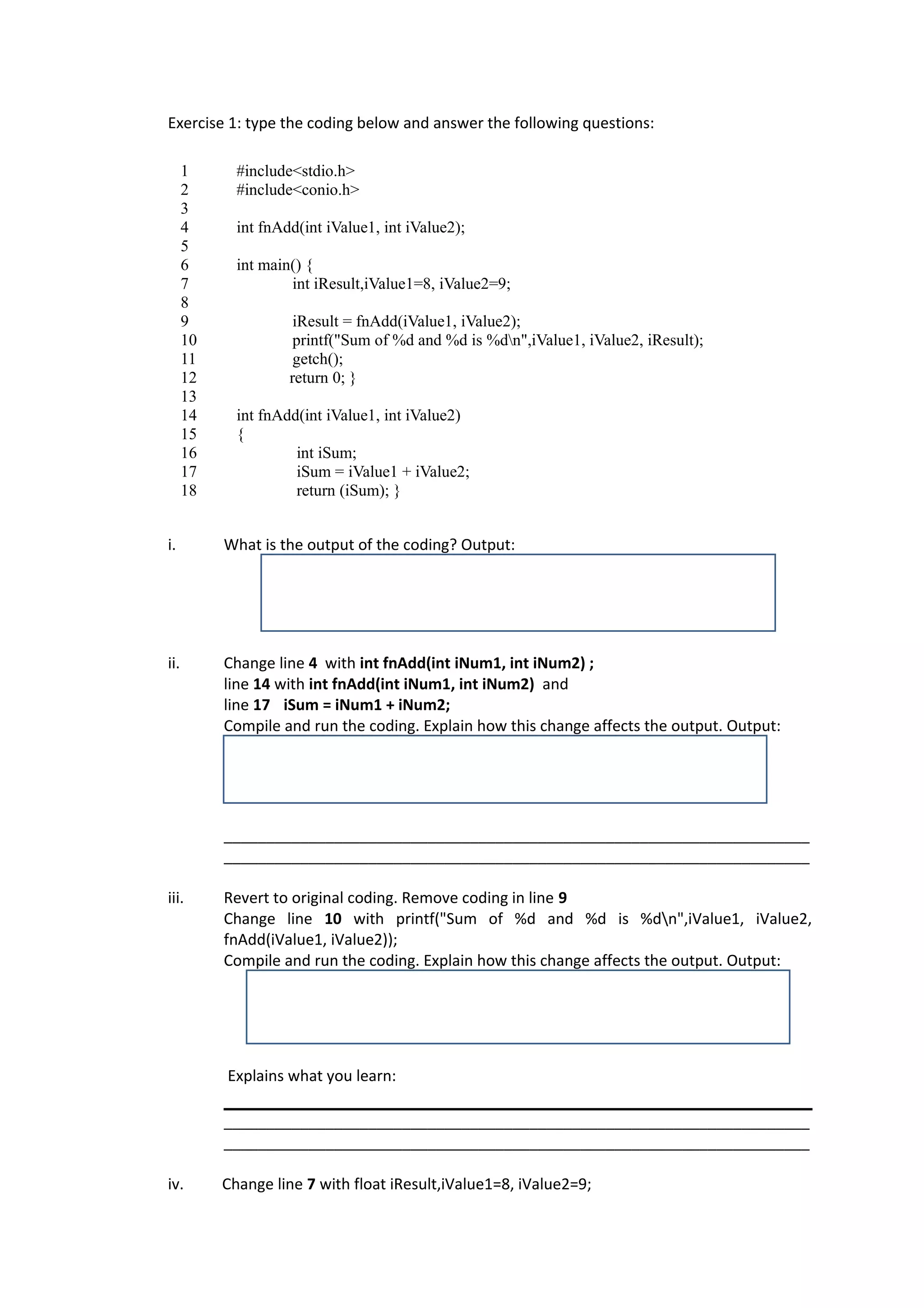 There are errors in the function prototype and definition. The function prototype in line 4 declares the function as int fnAdd(int iValue1, int iValue2) but the definition in line 14 is int fnAdd(inum1, inum2). The parameter names must match between the prototype and definition.