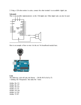 The document discusses generating audio output from an Arduino board by connecting a speaker. It provides code examples to play single tones, a melody, and allows custom music to be played by modifying the code. The tone() function is used to generate square waves of specific frequencies from a digital pin connected to a speaker via a resistor, producing the vibration needed for sound.