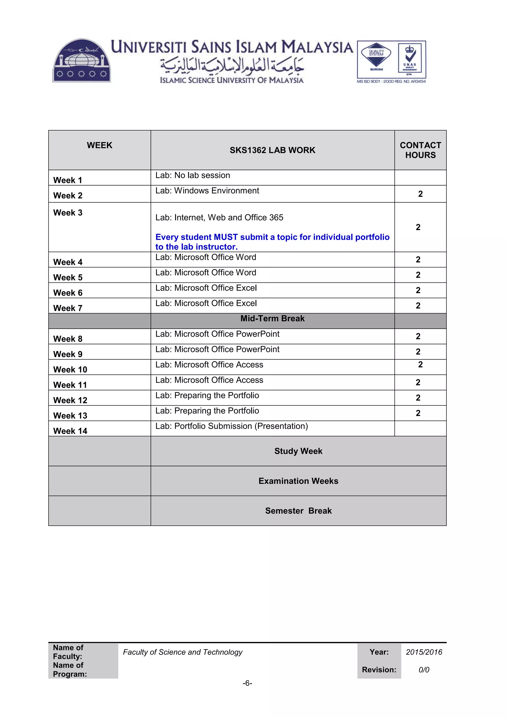 The document outlines a 14-week lab schedule for a course. It includes the topics covered each week, which focus on Microsoft Office programs like Word, Excel, PowerPoint, and Access. Students are required to submit an individual portfolio topic in Week 3. Lab assessments will include projects completed in the various Office programs, together making up 20% of the total grade.
