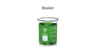 This document lists various pieces of lab equipment including beakers, Erlenmeyer flasks, stir rods, graduated cylinders, eye droppers, microscopes, Bunsen burners, weigh paper, metric rulers, wire mesh, test tubes, test tube racks, stoppers, triple beam balances, thermometers, ring stands, funnels, pipettes, filter paper, spring scales, and electronic scales.