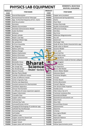 This document contains a list of product codes and corresponding item names for physics and chemistry lab equipment. There are over 250 items listed between the two categories. The items include common lab equipment like beakers, burettes, clamps, condensers, flasks, funnels, pipettes, stands, thermometers, and more. The document provides product codes to uniquely identify each item for ordering or inventory purposes.