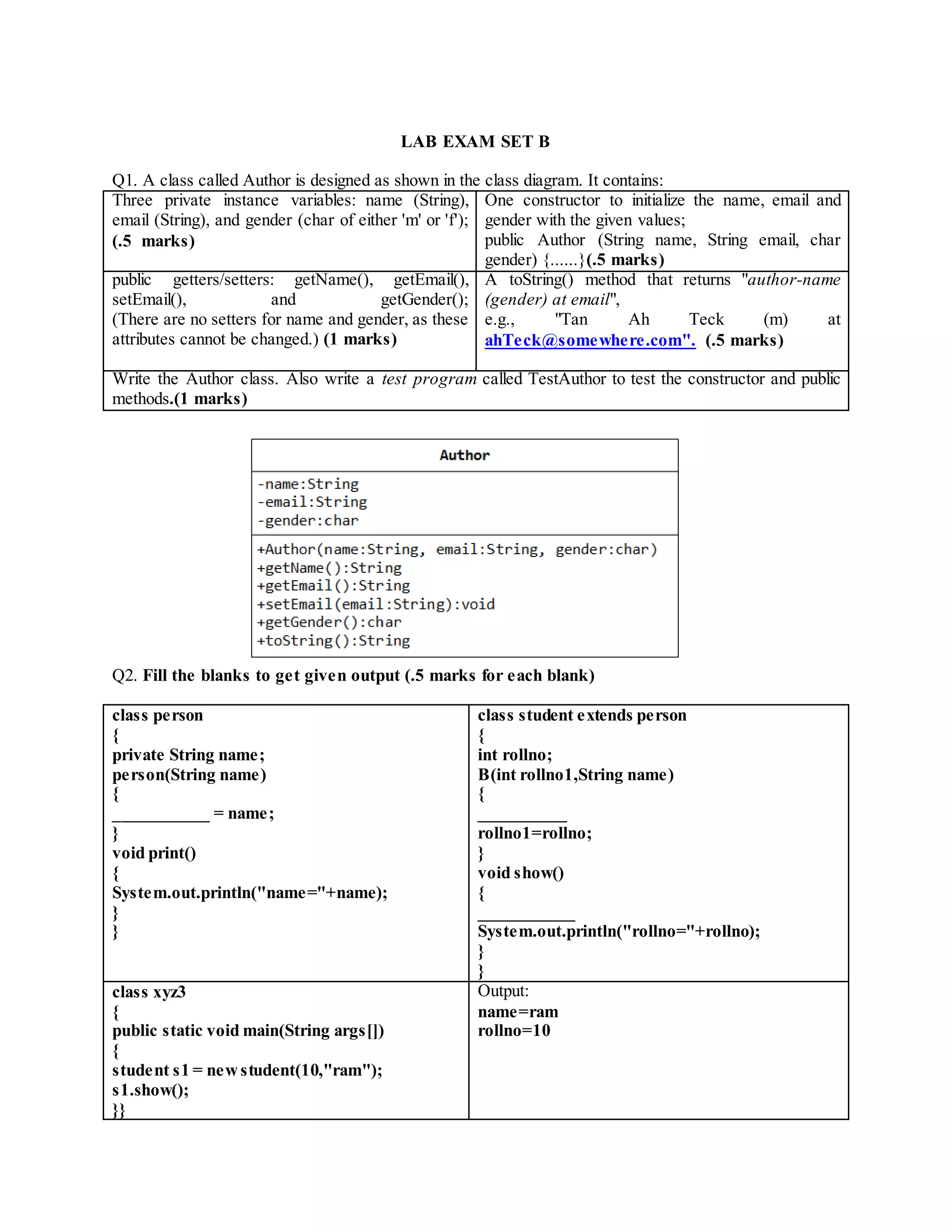 The document describes a lab exam question that involves defining an Author class with name, email, and gender instance variables and associated getter and setter methods, except for name and gender which cannot be set. It also includes a toString method to return a string with the author name, gender, and email. Students are tasked with writing the Author class and a TestAuthor class to test it. The second question provides code snippets to fill in blanks to produce the given output of printing a student's name and roll number.