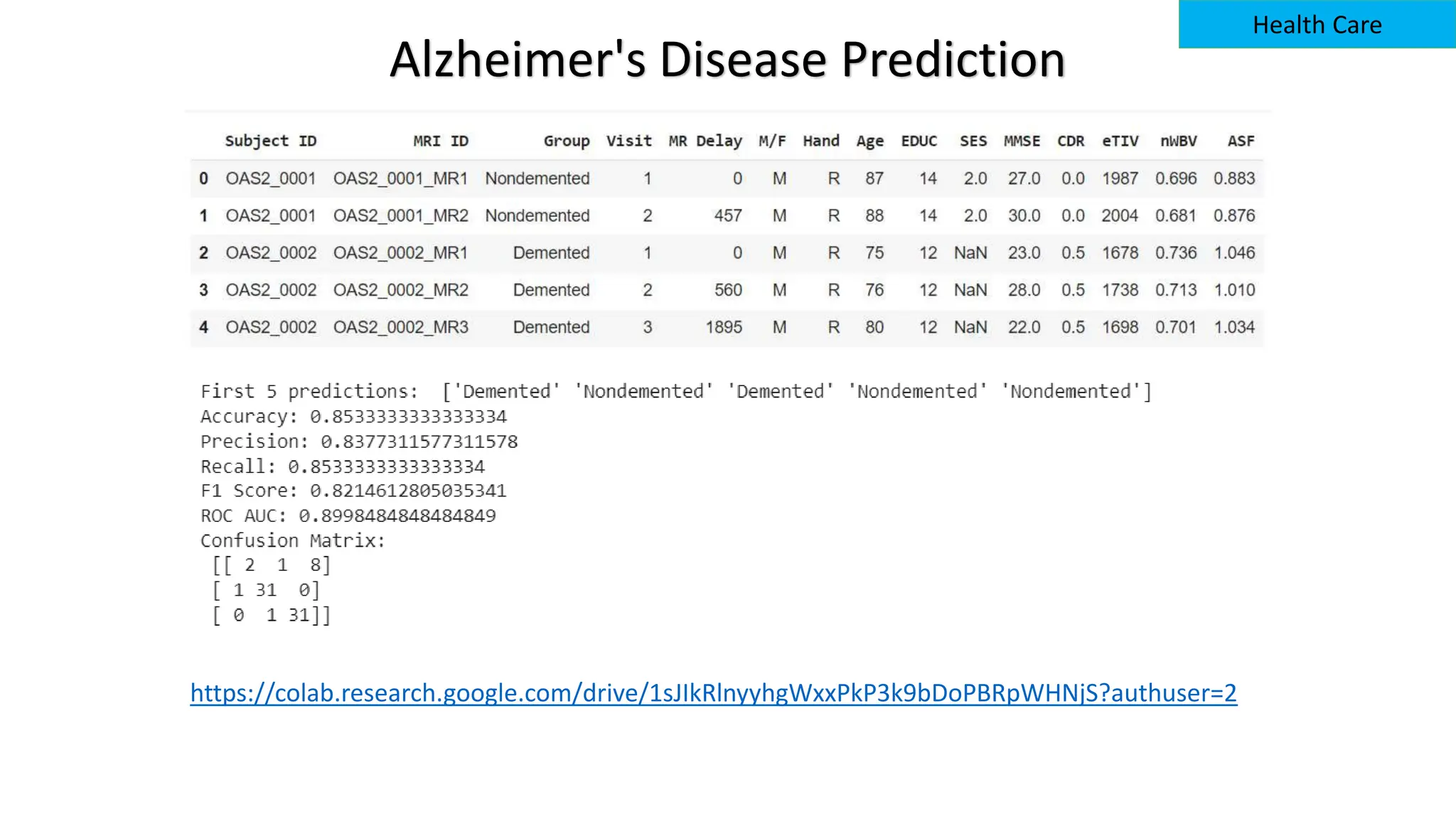 The document contains links to various lab exercises related to health care and cyber security, including prediction models for diseases like Alzheimer's, heart disease, and diabetes, as well as mental health assessments using NLP. Additionally, it features resources on AI operations (AIOps) and stock forecasting techniques. Each topic includes links to Google Colab notebooks for practical implementation.
