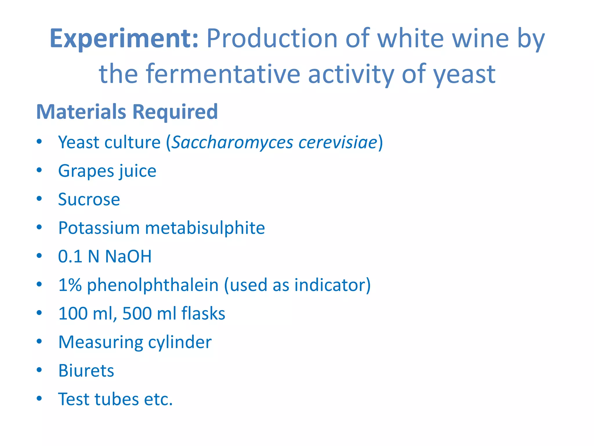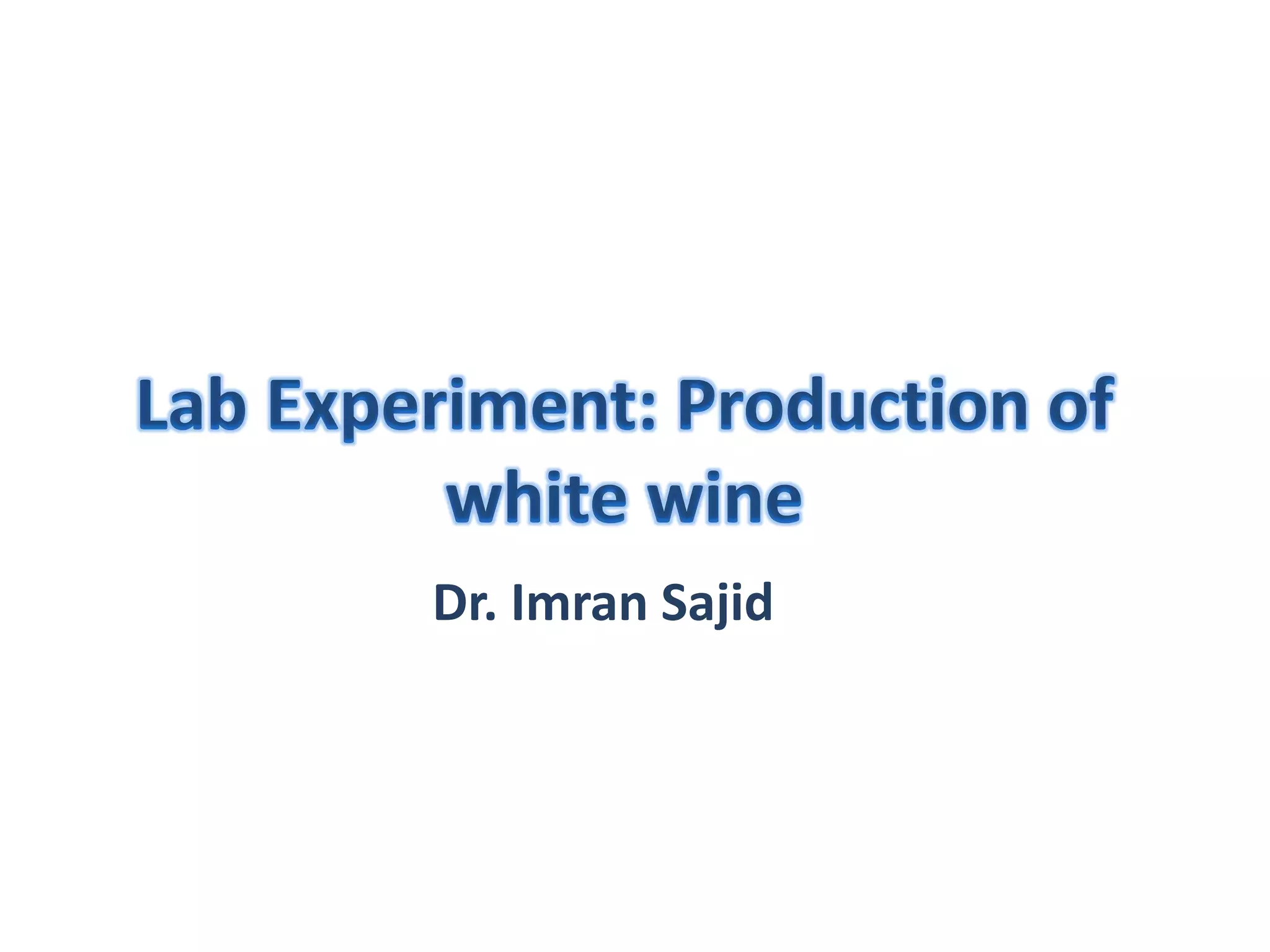 This experiment aims to produce white wine through yeast fermentation of grape juice. The key materials needed are yeast culture, grape juice, sucrose, and various chemicals. White wine is produced when yeast cells in grape juice biochemically convert sugars like glucose and fructose into ethanol and other compounds, imparting characteristics of taste, aroma, and alcohol content. The process involves inoculating crushed grape must with wine-producing yeast, followed by aerobic and then anaerobic incubation over 3-5 weeks. Properties of the fermenting wine are examined weekly to track changes in taste, odor, clarity, acidity, volatile acidity, and alcohol content.