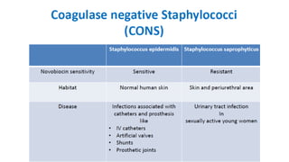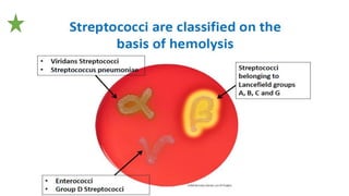 This document summarizes key microbiological characteristics of gram positive cocci including staphylococci and streptococci. It describes how staphylococci such as Staphylococcus aureus appear as golden yellow colonies with beta hemolysis on blood agar and are catalase positive. It also discusses the coagulase test to differentiate S. aureus from other staphylococci. For streptococci such as Streptococcus pyogenes, it notes their appearance as pinpoint colonies with wide beta hemolysis on blood agar. The document also briefly mentions Lancefield grouping and characteristics of common pathogenic strains of S. pyogenes and S. agalactiae.