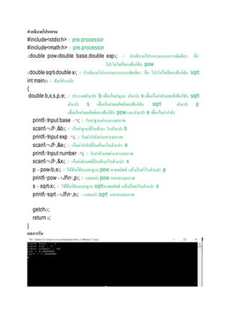p = pow(b,e); // ใช้ฟังก์ชันมำตรฐำน pow หำผลลัพธ์ แล้วเก็บค่ำในตัวแปร p