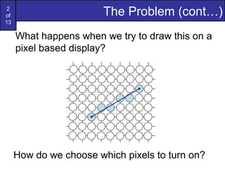 Bresenham's line algorithm uses incremental integer calculations to determine which pixels to turn on when drawing a line on a pixel-based display. It works by calculating a decision parameter Pk at each step k to determine whether to plot the pixel at (Xk+1,Yk) or (Xk+1,Yk+1). For a given line from (30,20) to (40,28), the algorithm is applied by initializing P0=6 and then iteratively calculating Pk+1 at each step k by adding either 2dy or 2dy-2dx depending on whether Pk is positive or negative. This tracks the line from (30,20) to (40,28)