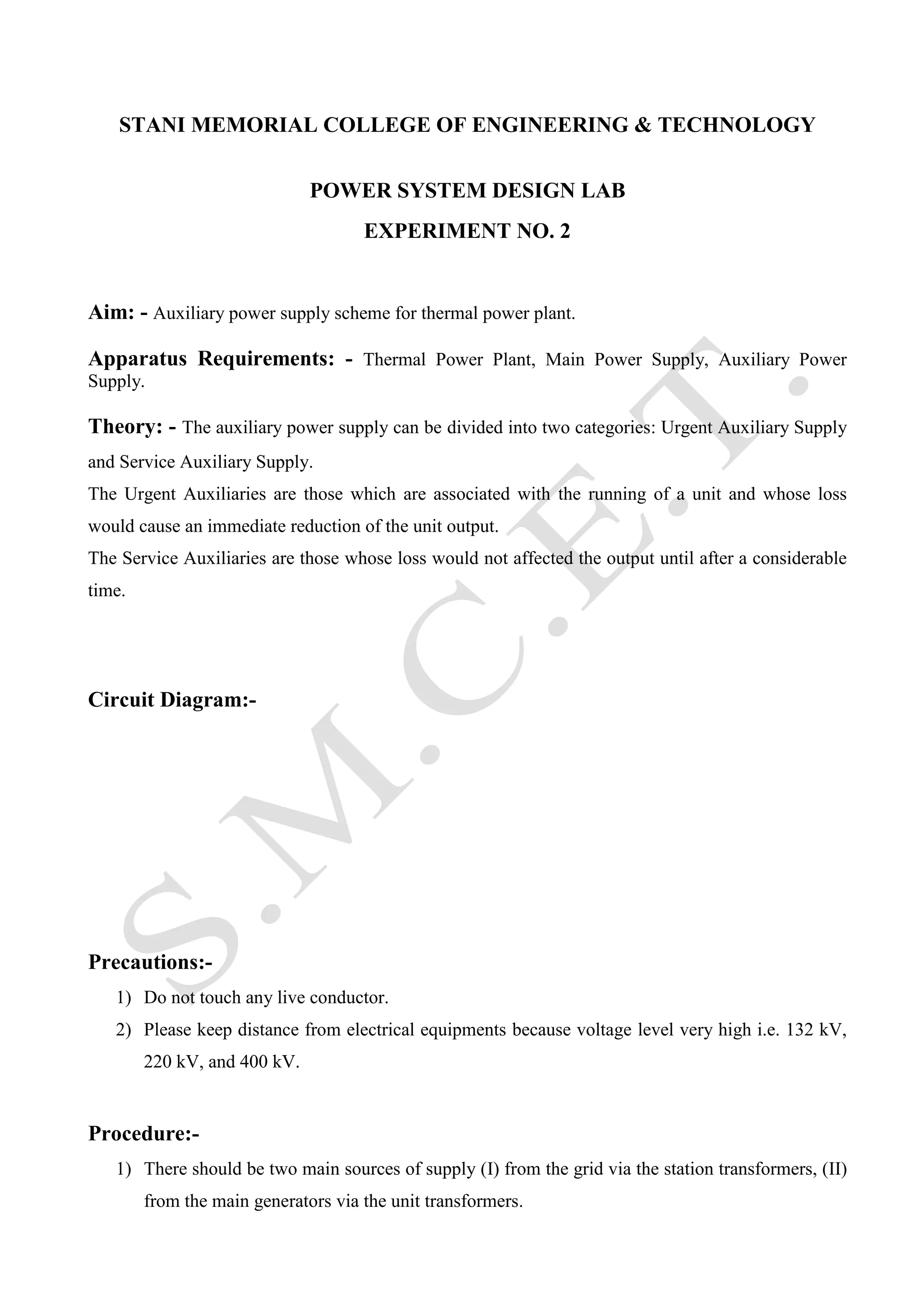 The document discusses the auxiliary power supply scheme for a thermal power plant. It divides auxiliary power supplies into two categories: urgent and service. Urgent auxiliaries are associated with running a unit and their loss would immediately reduce unit output. Service auxiliaries' loss would not affect output until after some time. The procedure involves supplying urgent auxiliaries from unit transformers and service auxiliaries from station transformers, with each unit having a separate supply. A standby supply is also provided to rapidly bring a unit back online if a normal supply circuit fails.
