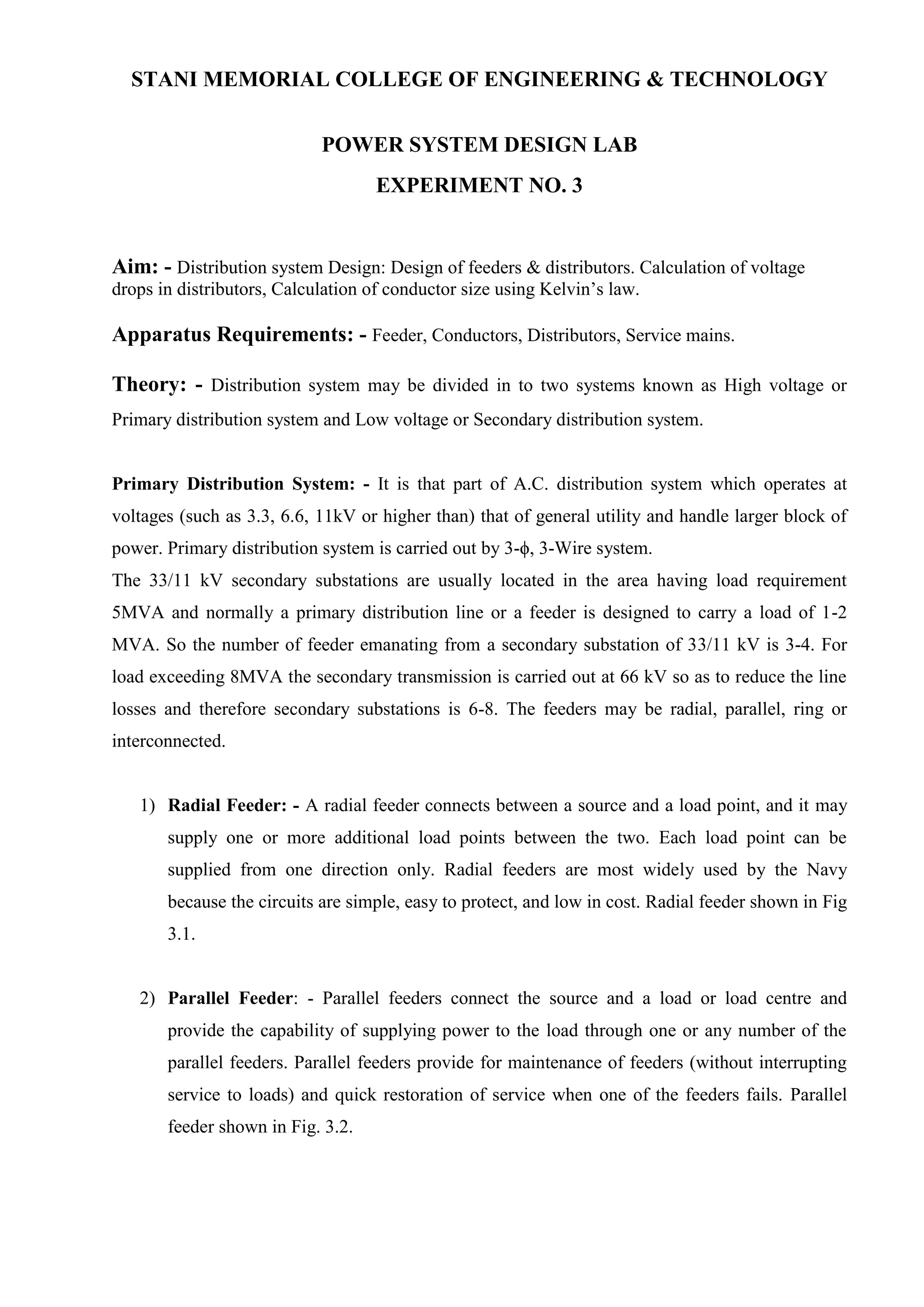 This document describes an experiment on distribution system design. It discusses the design of feeders and distributors, and calculating voltage drops in distributors. There are different types of feeders - radial, parallel, loop, and interconnected network systems. Kelvin's law provides a method to calculate the most economical conductor size by equating the annual cost of energy losses to the annual interest and depreciation costs. However, Kelvin's law has limitations including inaccurate energy loss calculations and changing costs over time.