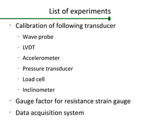 This document provides instructions for 8 experiments involving the calibration of various transducers and the use of a data acquisition system. The experiments will calibrate a wave probe, LVDT, strain gauge, accelerometer, pressure transducer, inclinometer, load cell, and use a signal generator with a data acquisition system. For each experiment, the relevant apparatus, purpose, working principle, and step-by-step procedure are outlined. Upon completion, students will analyze the experimental data and write a report with the required elements.