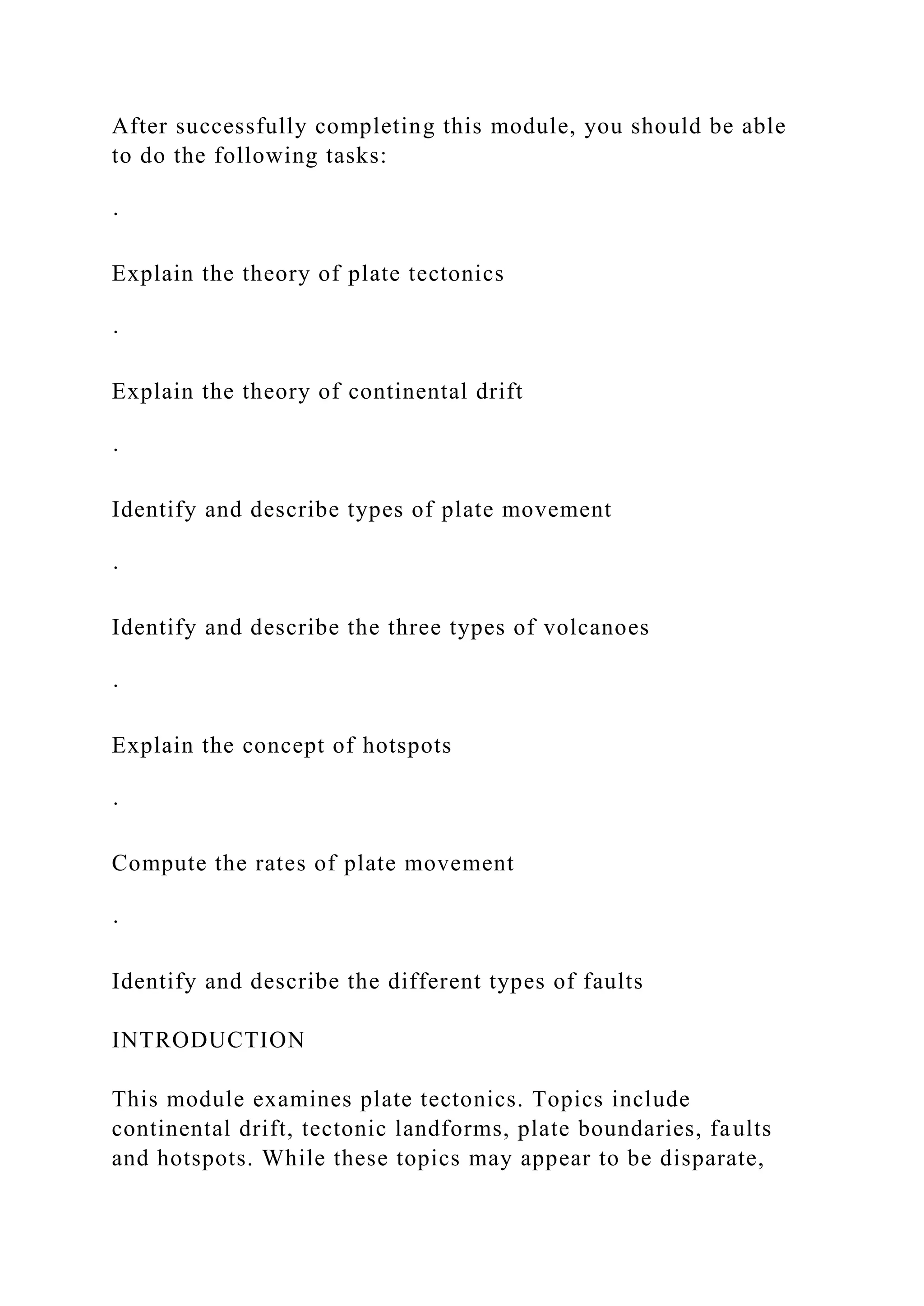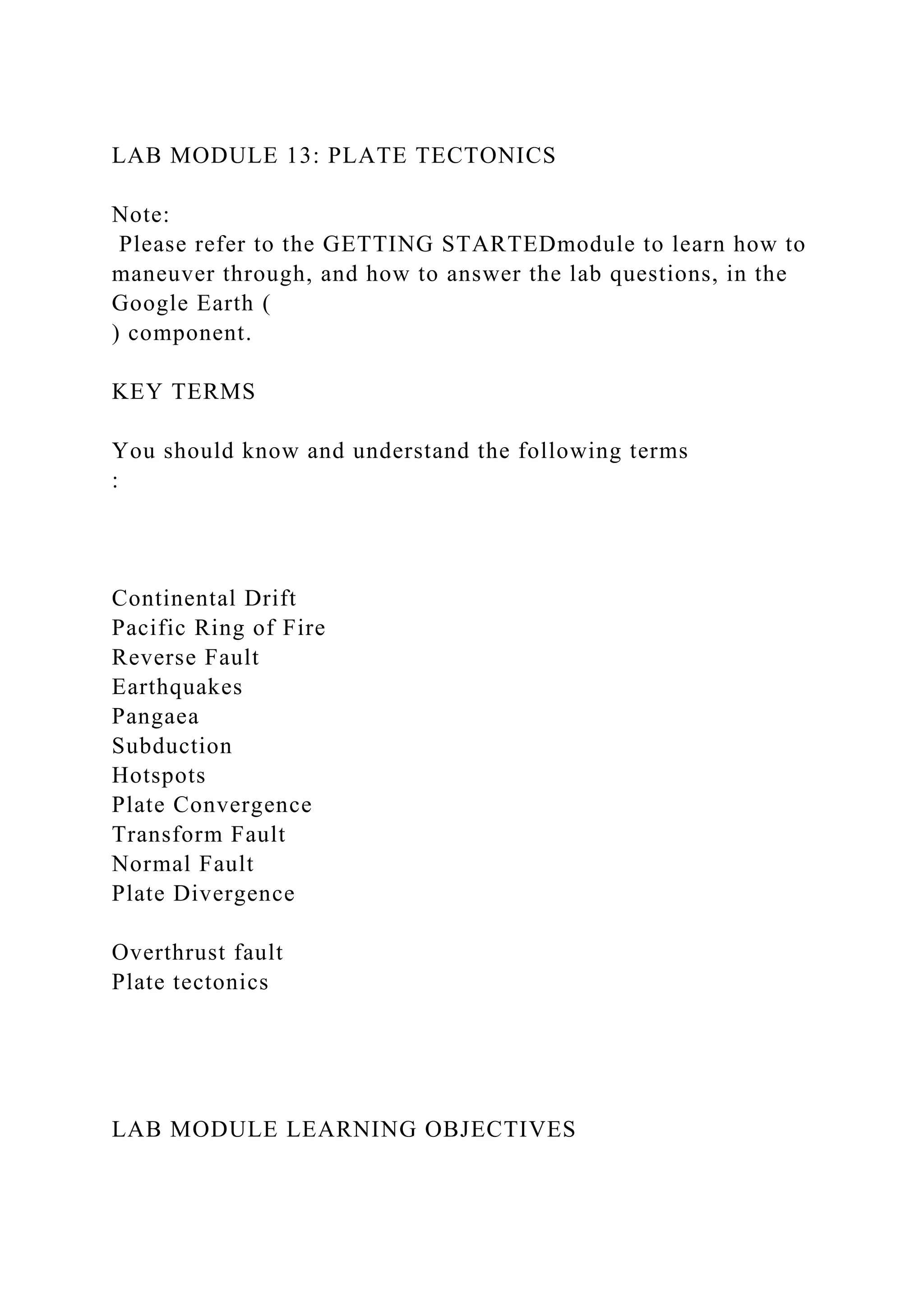 This document outlines a lab module focused on plate tectonics, covering key concepts such as continental drift, tectonic landforms, plate boundaries, and earthquake dynamics. It includes learning objectives, tasks, and questions for students to answer based on interactive Google Earth components. The module emphasizes the interconnectedness of geological processes and the implications of living near tectonic plate boundaries.