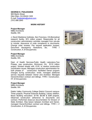 George Psaledakis has over 30 years of experience in construction project management and construction administration for a variety of project types including biomedical research facilities, public health laboratories, community college buildings, seismic retrofits of historic buildings, airport facilities, K-12 schools, and more. His roles have included project manager for architecture firms, construction engineer for a large construction company, and project manager for an architecture firm. He has managed projects ranging from $3 million to $110 million and brings expertise in code compliance, construction documentation, scheduling, budgeting, contract administration, and close-out processes.