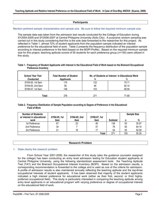 The research problem is to compare the teaching aptitude scores among entry level applicants in an educational program with varying degrees of preference or interest in the educational field of work as measured by the Brainard Occupational Preference Inventory (BOPI).