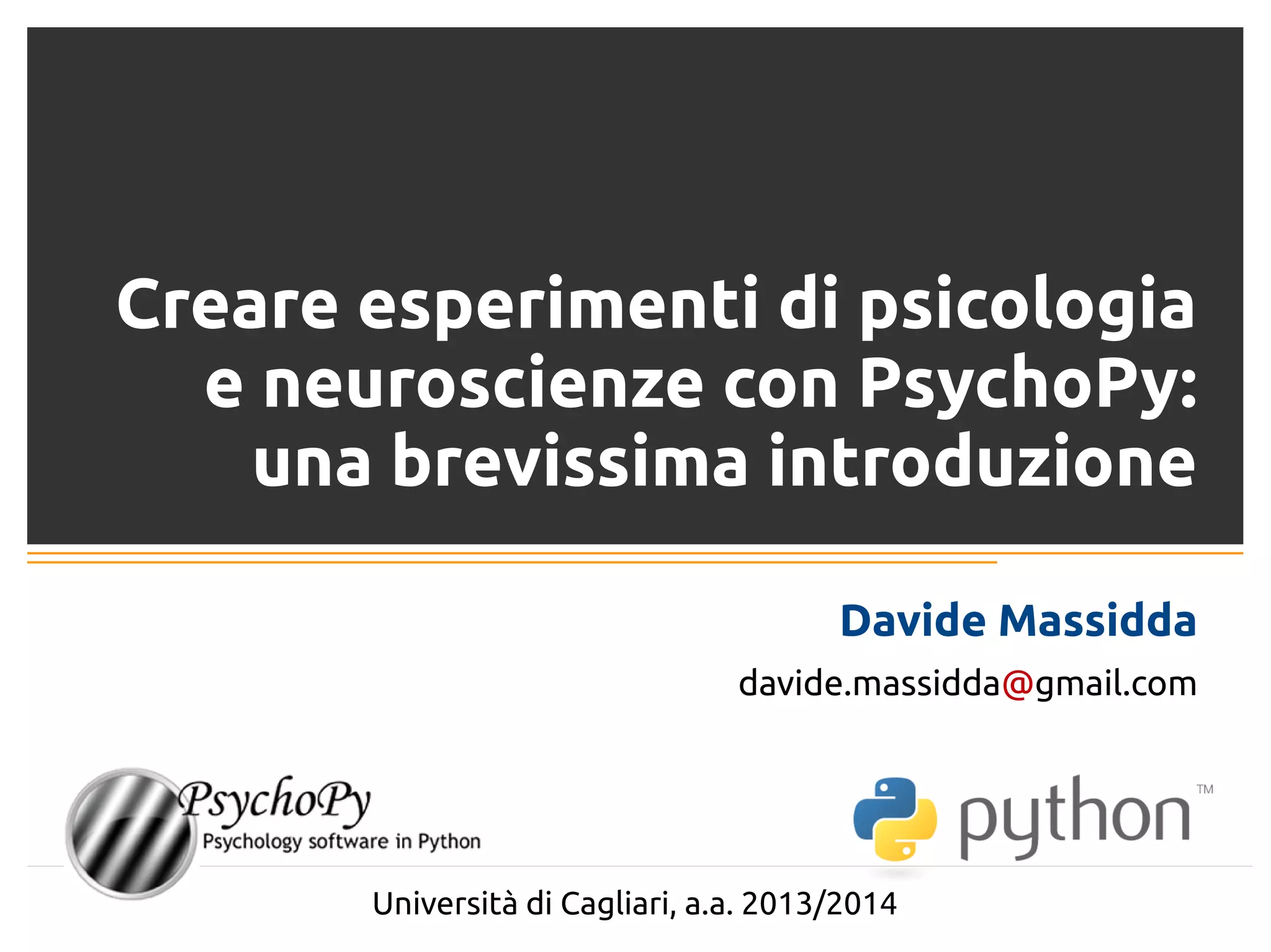 Il documento fornisce una guida per la creazione di esperimenti di psicologia e neuroscienze utilizzando il linguaggio di programmazione Python e il modulo Psychopy. Viene spiegato l'effetto Simon e come strutturare un disegno sperimentale, insieme alle istruzioni per l'installazione e l'organizzazione dei file necessari per realizzare esperimenti. Inoltre, il documento sottolinea l'importanza della standardizzazione delle condizioni sperimentali e fornisce risorse utili per approfondire l'argomento.