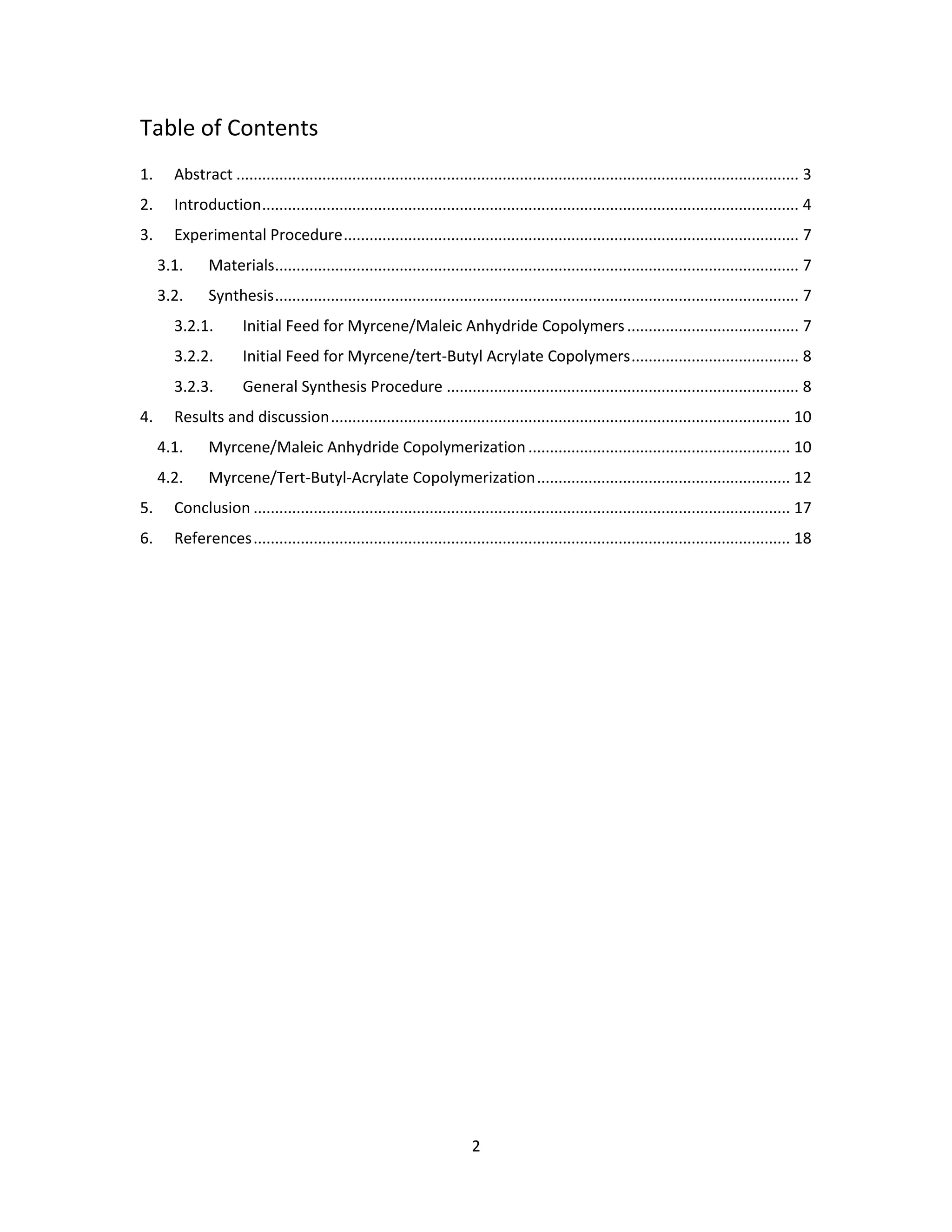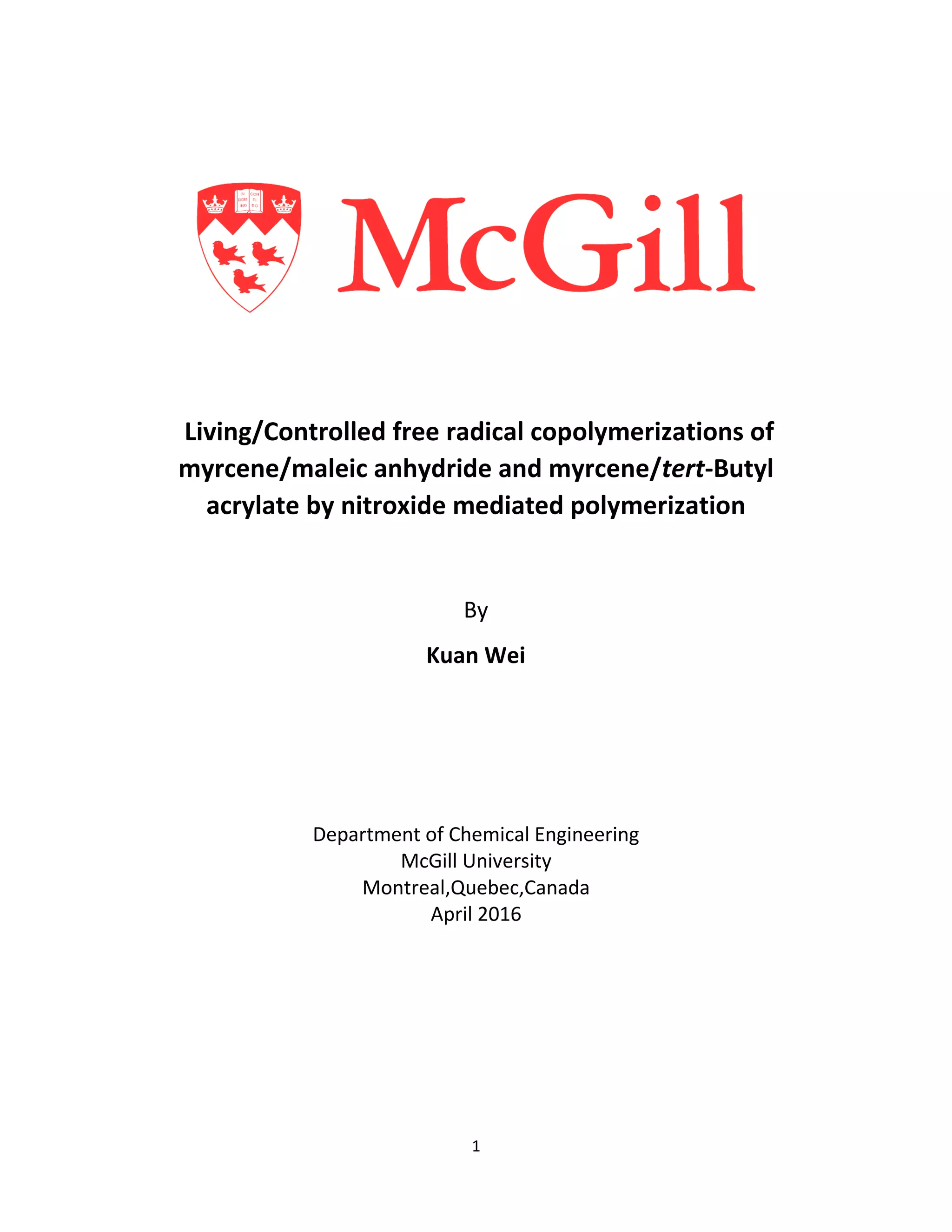 This document describes an experiment to synthesize copolymers of myrcene with maleic anhydride or tert-butyl acrylate using nitroxide mediated polymerization with NHS-BlocBuilder initiator. Myrcene/maleic anhydride copolymerization was unsuccessful likely due to a side Diels-Alder reaction between the monomers. Myrcene/tert-butyl acrylate copolymerizations with varying monomer feed compositions were more controlled. Analysis of the copolymers found decreasing molecular weight and low polydispersity as the tert-butyl acrylate content increased, possibly due to intramolecular backbiting terminations.