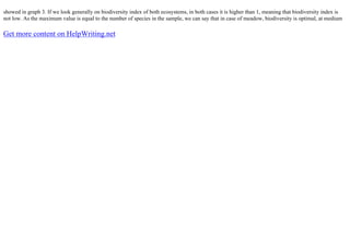 This document discusses how biodiversity provides benefits to ecosystems and all living creatures. It is important to maintain biodiversity as it provides food, water, and shelter. The research measured biodiversity in 5 locations around a college campus undergoing construction to see how disturbance affects biodiversity. The results showed locations further from a stream had less biodiversity, while the campus site had more biodiversity due to diverse habitats and transition areas. Preserving biodiversity through conservation of species and habitats is important for balanced ecosystems.